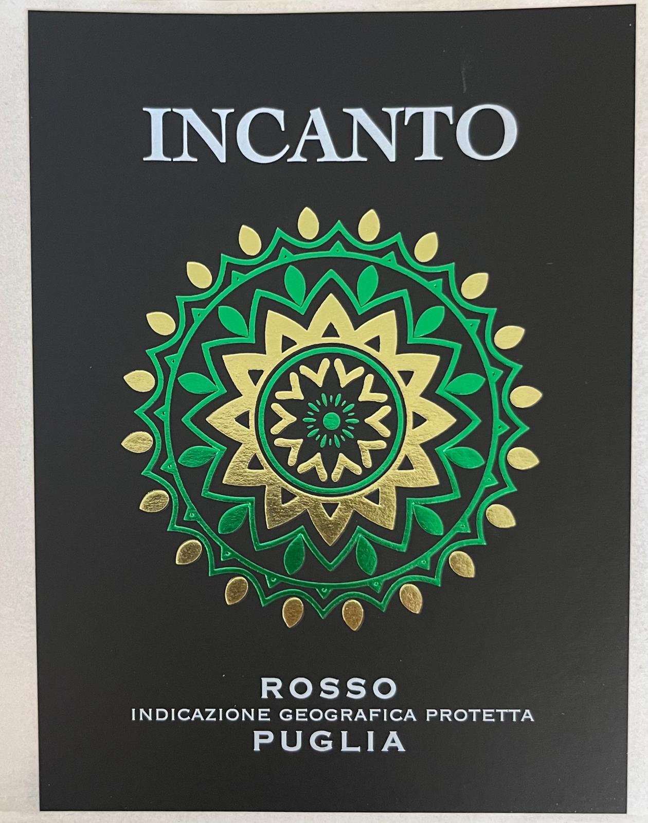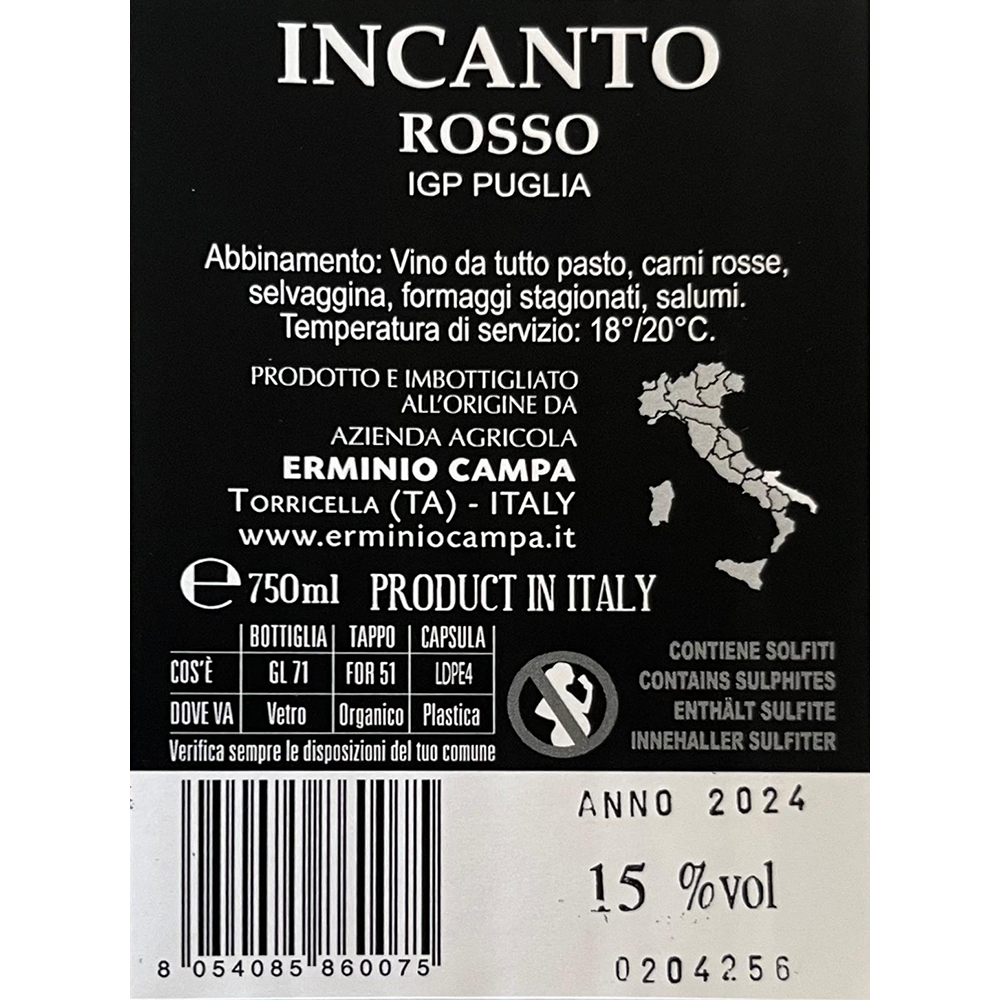 Kirjeldus: Incanto Rosso on lummav punane vein, mis peegeldab Puglia päikeselist iseloomu ja Erminio Campa veinimaja kirge kohaliku terroir’i vastu. Vein pakub sügavat rubiinpunast värvust ning aroomibuketti, kus kohtuvad küpsed metsamarjad, mustad kirsid, vürtsid ja õrn vanilje. Maitses on vein jõuline ja sametine, tunda on tumedaid puuvilju, šokolaadi ja kerget rösti. Tasakaalukas happesus ja pehmed tanniinid loovad pika, soojendava järelmaitse.